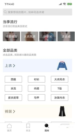 DeepFashion app对服装图片进行了分类,用户可以按照服装的文理、面料、类别搜索自己想看的服装类型;