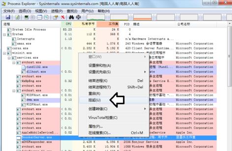 2.对待有怀疑的程序,先使用鼠标右键点击,在弹出的菜单中选择挂起。
