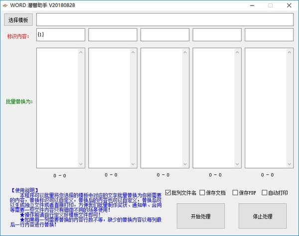 本程序可以批量将您选择的模板中对应的文字批量替换为你所需要的内容,替换标识可以自定义,替换后的内容也可以自定义,替换后可以生成独立文件或者直接打印,方便我们批量制作奖状、通知单、合同等需要一些文件内容只有细微不同的场景使用!【操作流程】