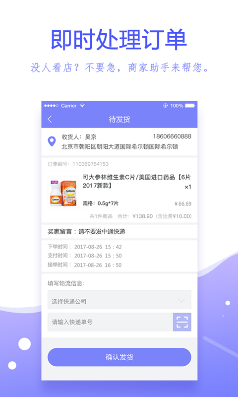1,快速订单处理:智能自动接单,实时消息提醒;2,多维查询:实时查询订单配送状态,售出商品统计;