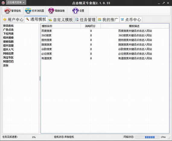 2、点击“通用模板”,可选择点击精灵自带的模板类型,包括排名优化、广告点击、下拉列表、相关搜索、搜索指数、提升数量、提升人气、网络投票、淘宝专区、阿里巴巴和京东等模板,如点击排名优化,这里可选择百度搜索、360搜索、搜狗搜索、搜搜搜索、谷歌搜索、必应搜索和有道搜索,选择某个想要的模板,双击即可打开,并开始挂机。