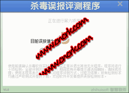 本程序将对你安装的杀毒软件进行误报检测,所有检测标本均通过严苛测试并可以完整下载。检测标准由智慧软件单独制定,使用本程序表示你已经认可本程序的评测方式、执行标准、过程及结果。本程序仅一个文件无需安装,评测过程需时约60秒,程序运行即开始检测。为保证评测公正我们会随时更新误报检测标本。运行前请访问官方网站确认你使用的是最新版本