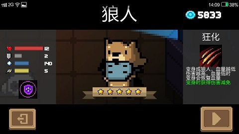 技能:狂化:变身成狼人,血量越低伤害越高,血量低时变身能够恢复血量(注:血量为1~2时施放技能回满血量,3~5回到6格血量,6~12不会回复血量)。
