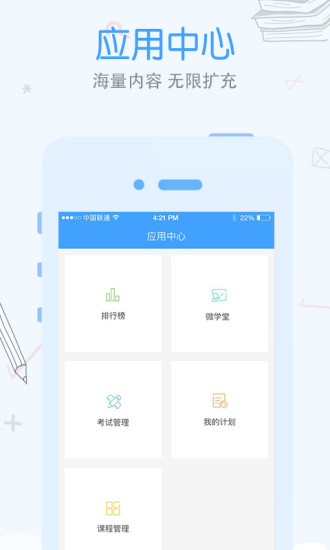 我的课程、我的计划、我的考试、课程超市、排行榜,所有功能尽在应用中心。在这里,我们与你共同成长!