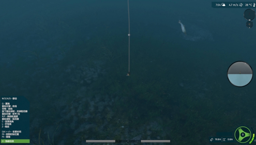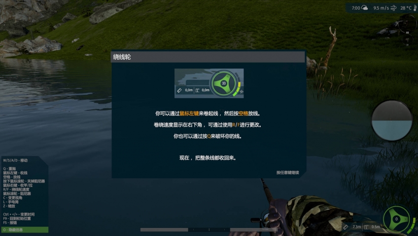 游戏中,鼠标右键是拉鱼(收线),左键是放线,大鱼需要溜鱼几下