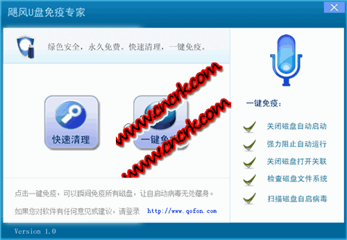 飓风一键免疫专家 V1.00 简体中文绿色免费版 飓风u盘免疫专家1.00是飓风电脑中心的又一最新力作,飓风电脑中心以“免费,全面,快速,彻底”为发展方针来设计飓风u盘免疫专家v1.00,使它的界面十分简洁,继承了飓风清理助手v1.00的风格。飓风电脑中心的工程师说:“飓风u盘免疫专家v1.00可以在十几秒内清理u盘病毒的自启动,使病毒无法威胁电脑,然后可以利用飓风u盘免疫专家的”一键免疫“功能,使电脑的所有盘符,更可以是u盘,从此不用再受u盘病毒的侵害。” 上网达人,互联网爱好者,电脑新手和学生老师们都应该具备!
