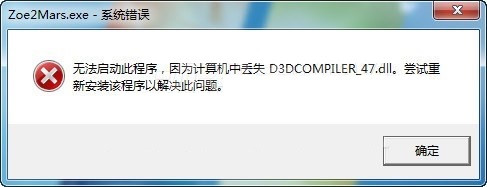1、使用Win 7系统的玩家若运行游戏时出现“无法启动此程序,因为计算机中丢失D3DCOMPILER_47.dll”的错误提示(如下图所示),请安装游戏根目录中的“Windows6.1-KB4019990-x64.msu”补丁;