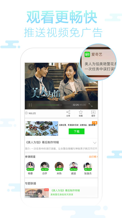 奇艺高清影视播放清晰流畅,支持锁屏后离线下载、离线观看、视频搜索等功能 。最新版本速度全面提升,稳定性更高,内容更新更及时!真正为用户带来“悦享品质”的视觉盛宴。