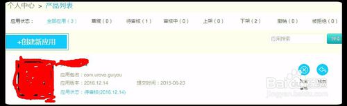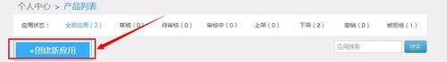在点开的产品列表中可以看到你的应用的相关信息及状态,点击“创建新应用”图标。