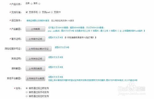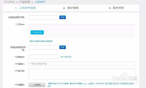 打开产品发布界面,在这里上传APP应用安装包,并完善应用程序的相关信息。