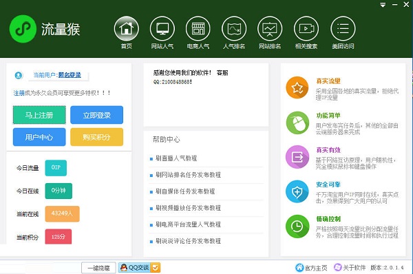 流量猴软件无须注册用户名,填入要提升流量的网址或者要提升Alexa排名的网站,点击“开始优化”按钮即可。没有任何电脑基础的人,也能一分钟轻松上手操作。并且永久免费,全面支持XP,2003,Vista,Win7操作系统。同时对有些网站上弹出的广告放入安全沙盒中,避免弹出广告发出声音干扰,又能计算弹出广告流量,对网站主的广告收入有非常显著的提升效果。