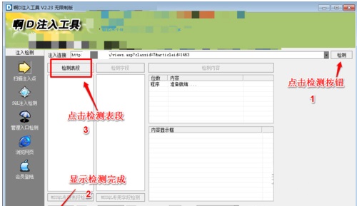 2、点击软件左边的“扫描注入点”功能,在地址栏输入需要检测的网站地址,点击地址栏后面的检测按钮。