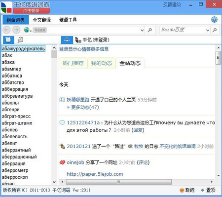 千亿俄语词霸官方版提供一站式查询平台,支持多语种网络全文翻译。全文翻译新增查询选中词的功能,在原文框或解释框内双击查询词,即可在千亿词库内查询,得出精确的结果。通过网络查询最新翻译,无限容量词库,翻译永不过时。千亿词霸涵盖了大量的俄语资讯、俄语时事新闻、语法、口语、日常俄语、俄语导游词等资料,是国内最全的俄语学习网站。【功能详情】