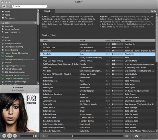 界面华丽。有人说Spotify是iTunes的变种,一点也不过分,虽然有着与iTunes和Songbird相似的用户界面,但相对于这两个软件,Spotify在Windows下的表现更加出色,低配PC中软件的响应速度也非常快。