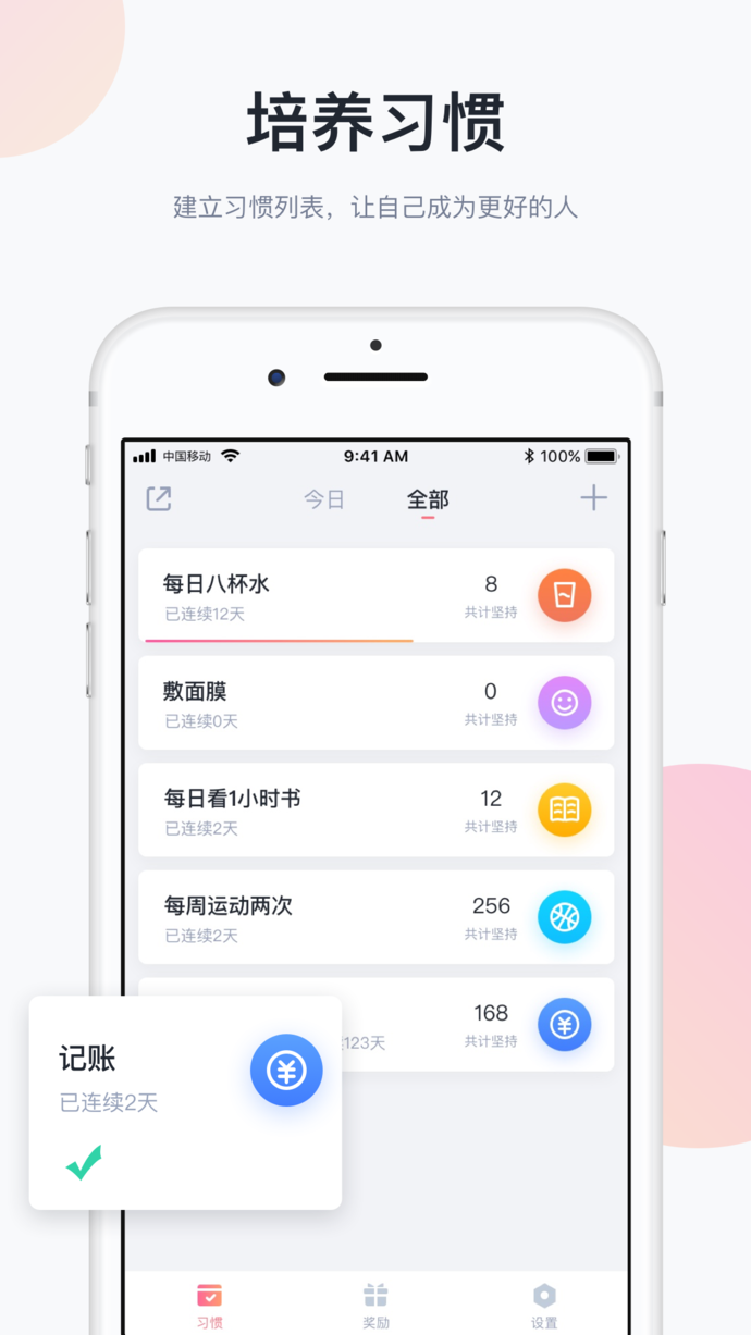习惯的力量。 极简易用习惯养成。拒绝拖延,坚持打卡。培养好习惯,虽然每个习惯的影响相对来说比较小,但是随着时间的推移,这些习惯综合起来却对我们的健康、效率、经济以及幸福有着巨大的影响。