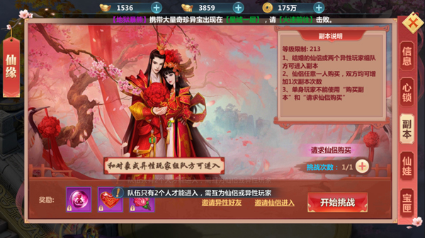 1、结婚的仙侣或两个异性玩家组队方可进入副本。