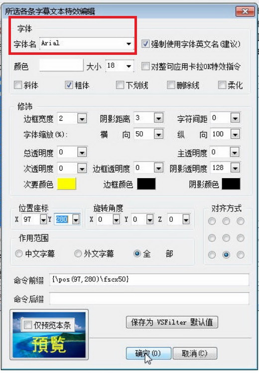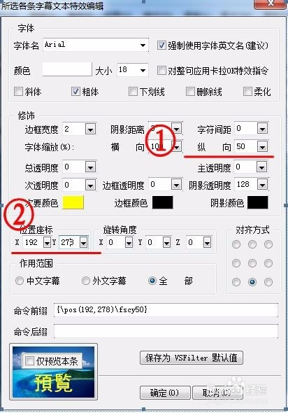 ②3D电影是双字幕合成3d字幕,所以要设置字体拉伸。