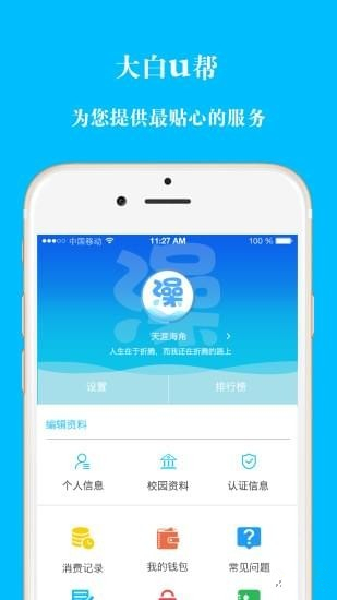 大白U帮app是一款专门面向大中专院校用户校园服务的手机客户端软件。大白U帮app用户成为注册用户后,即可使用本客户端软件预约可以提供洗澡服务的洗澡间,用户可以自己选定使用服务的时间并通过个人账户的余额进行结算。大白U帮app同时对接了数量庞大的洗澡硬件系统,“大白U帮”提供了非常好的人机交互界面和线上功能。