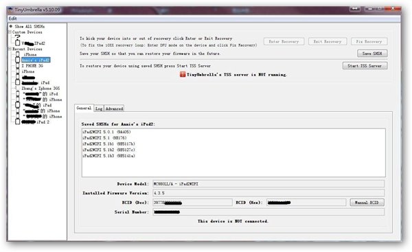 第一步、将需要降级的iOS设备连上电脑,运行TinyUmbrella,选择希望降级的系统版本SHSH备份,之后点击“StartTSSServer”;
