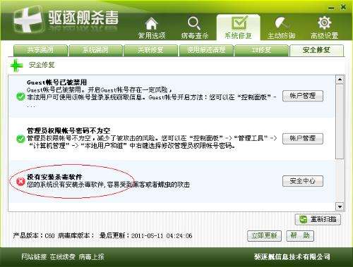 所有项目检测完毕,对于检测到有问题的项目,免费版“驱逐舰”将用红色叉号予以显示,并对应提供有修复方案。另外,该软件将根据检测结果自动的在主界面上显示对应的系统评分。