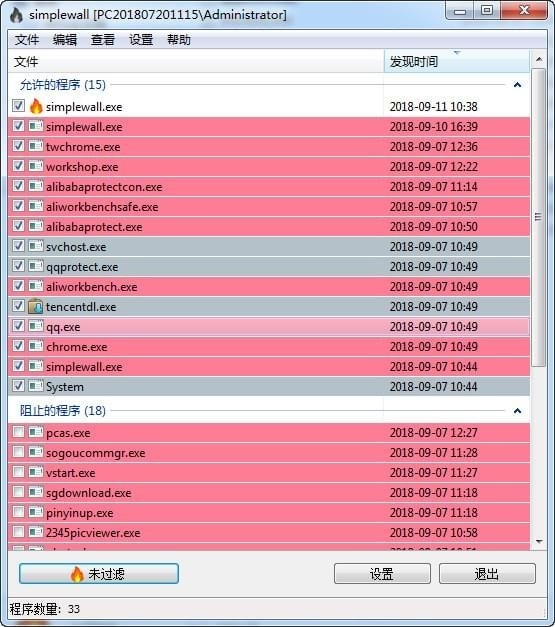 1、下载解压后运行simplewall程序,第一次打开时默认是未启用防火墙的(状态栏的图标是灰色),点一下下面的“未过滤“按钮,启用防火墙;个人建议使用白名单模式,只允许认可的程序出站,这样非白名单中的程序统统禁止联网。