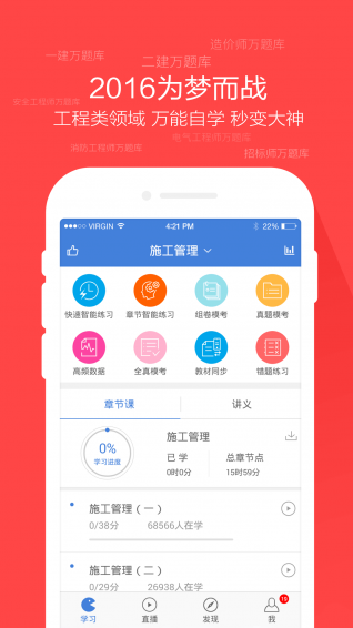 AppStore一建、二建、造价、安全、电气、招标、消防等工程和建造领域,遥遥领先的手机学习软件,备受考生喜爱的工程类学习软件!给你:首都优质教育资源 + 互联网教育黑科技 + 工程界大牛名师 + 改变传统教育的梦想 = 助你100% 通过考试