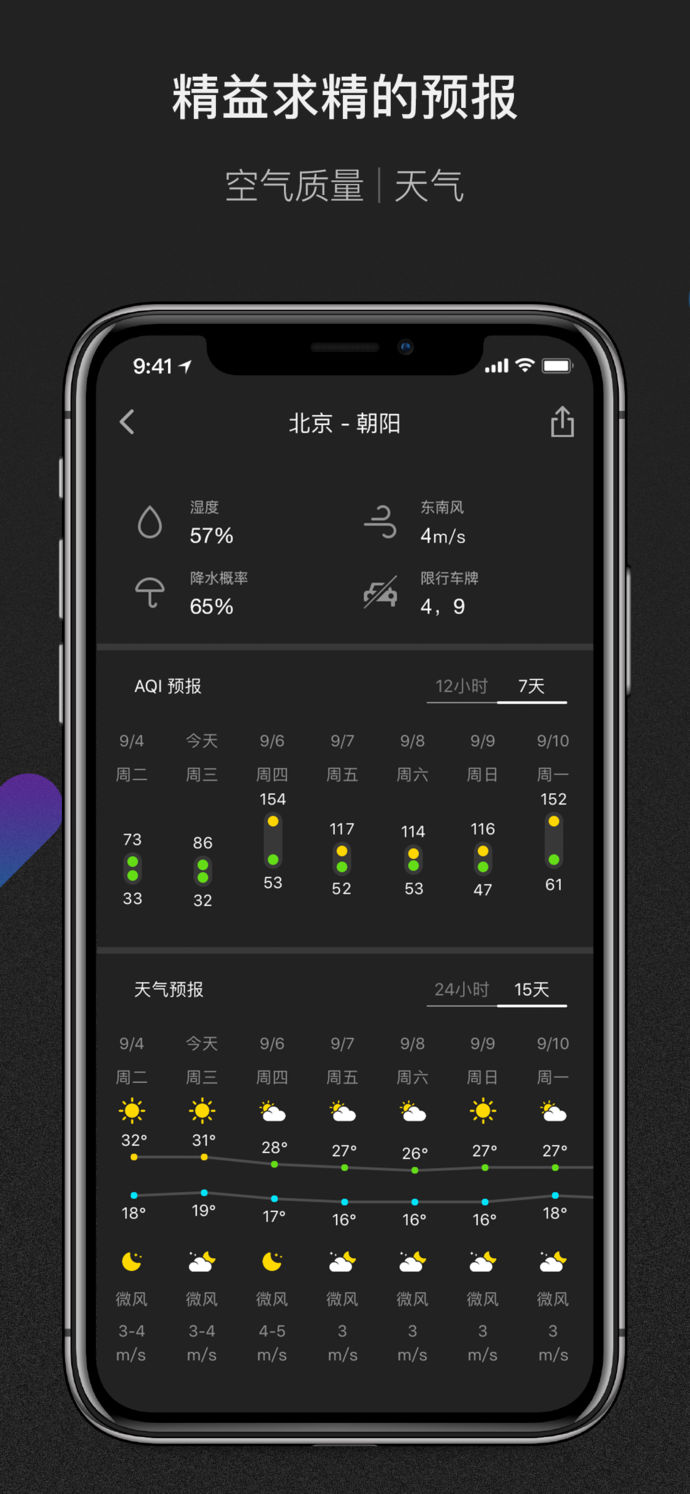 ● 实时天气、24 小时预报、15 天预报。
