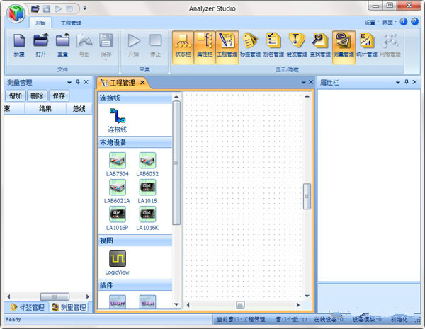 状态栏:状态栏中描述了当前设备的部分工作状态,以及框架管理的窗口、设备个数以及工程状态信息。(状态栏将不断增加更多功能,敬请关注。)