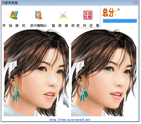 功能齐全的找茬游戏,左右两幅图都可以用来点击。还可以自己编辑游戏,支持自定义背景图片、背景音乐、游戏时间、放大镜数目、差异点数目等功能