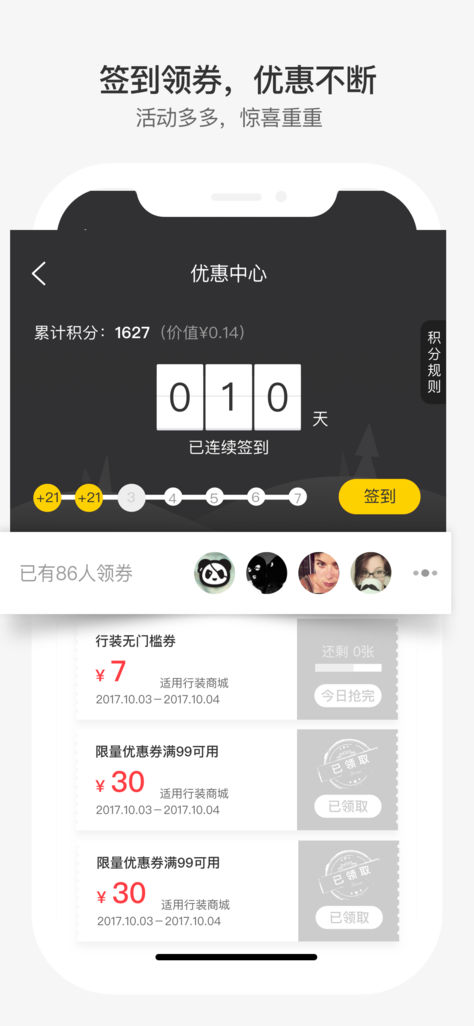 6、签到积分:每日签到可以获取积分,积分可以购物抵用,更优惠;