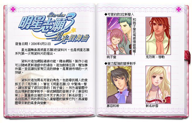 大宇著名游戏产品《明星志愿3》于2005年推出,在推出后大受好评,制作小组也趁机再推出一波新人,再次引发一股演艺圈的热潮。《明星志愿3星光圆舞曲》资料片产品包装采用了夜光质材,立体的造型,充分展现出星光熠熠的《明星志愿3》。预定将在2007年7月底上市,原本平静的演艺圈在度面临各种不同的冲击事件,也让演艺圈引起新的风暴。故事情节丰富,更胜原作。在剧中担任重要角色的杨安妤也表示,星光圆舞曲中王子与灰姑娘之间的浪漫恋情,扣人心弦。