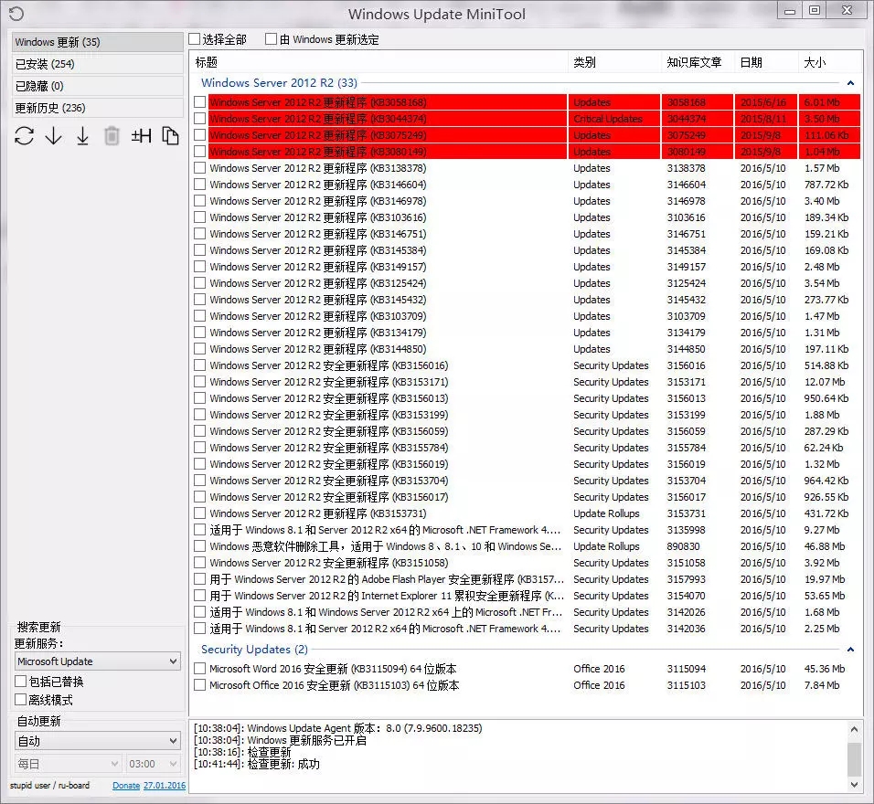 Windows Update MiniTool除了能手动更新补丁以外,还支持对特定更新补丁的高亮显示(如图,红色)。