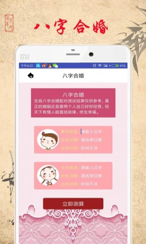 3、六合八字合婚:从易学的角度分析两个人之间的缘份,严密考虑两个人的八字之间的关系,用直观的数字来表示两个人八字的匹配度。