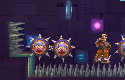 2、同样在第一个陷阱关卡以后的场景,你可以发现上方有一小部分的尖刺。此时有两种方法(1)豁出去,买个刺针保护罩碰着尖刺跳上去。(2)保住机器人,让机器人升起来,然后坐在机器人内跳跃冲刺过去,差不多的时候就跳出来进入那个地方。(这个方法比较保险)那里有X的配件。