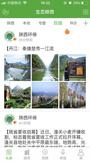 《生态陕西》是陕西官方手机软件,及时、权威发布生态环境类新闻、资讯、政策等。《生态陕西》APP是陕西省环保厅官方生态环境类手机软件,及时、权威发布生态环境类新闻、资讯、政策、科技、法律法规等。《生态陕西》以传播普及生态文明为宗旨,涵盖广播、电视、报纸、网站、手机网站、微博、微信、客户端等各种媒体形态于一体,只需轻轻点击相应的图标,就可以迅速浏览相关生态环境内容。软件总共设有头条、陕西、本地、空气、专题、双微、科普、政务、视频、举报10个版块。