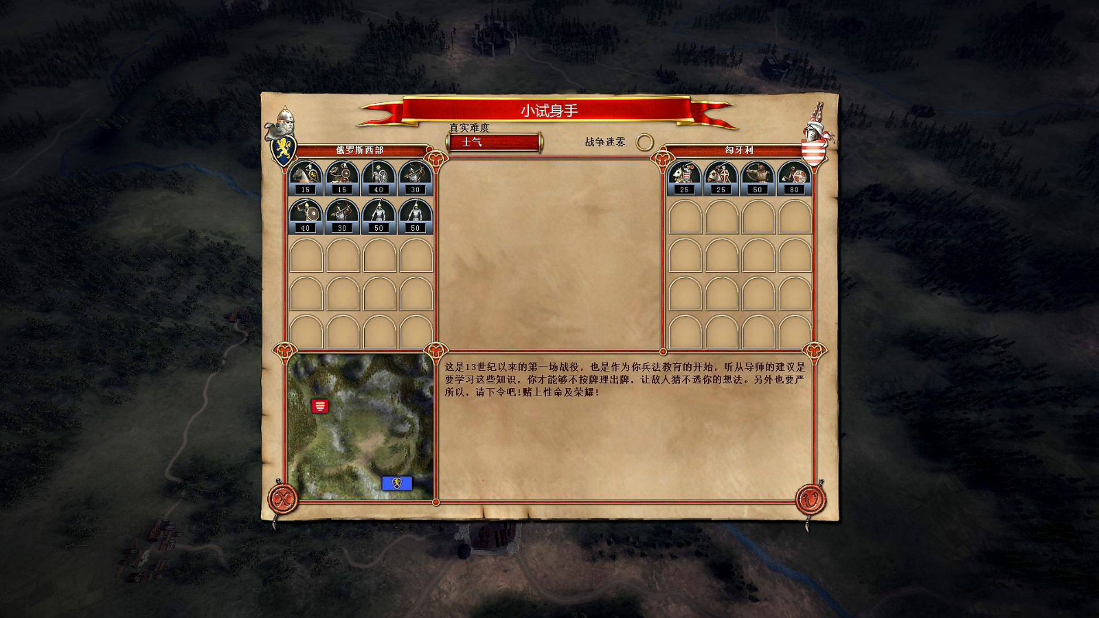 战法是,敌强我弱时,步兵和弓手占据一块高敌防守,留指挥官和1个二级骑兵团掩护,其他4个骑兵团根据地形待敌人进攻时采取后方包抄或者分两队夹击。敌弱我强时,步弓团缓慢推进,骑兵快速机动到敌人后方。