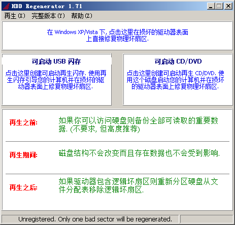 硬盘再生器可以修复您的驱动器吗?几乎60%的损坏的硬盘可以通过再生修复。你可以随时下载免费的演示版本,并尝试重新生成第一个发现坏扇区。未注册的演示版本的主要目的是显示一个报告,其中包含有关通过注册完整版本重新生成整个磁盘的可能性的信息。如果第一个发现坏扇区已成功重新生成,您可以购买该产品以重新生成您的硬盘驱动器上的所有坏扇区。如果第一个坏扇区尚未成功重新生成,则尽快更换硬盘驱动器。