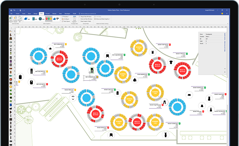 使用实际可视化对象传达实时数据。在 Visio 中或者利用 Office 365* 应用和服务,将形状和图表链接到常用源文件,并通过应用的形状格式设置,自动更新以反映基础数据更改。