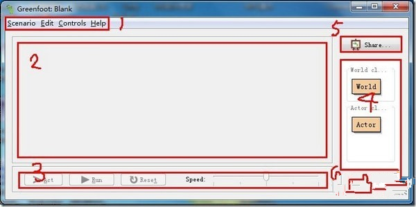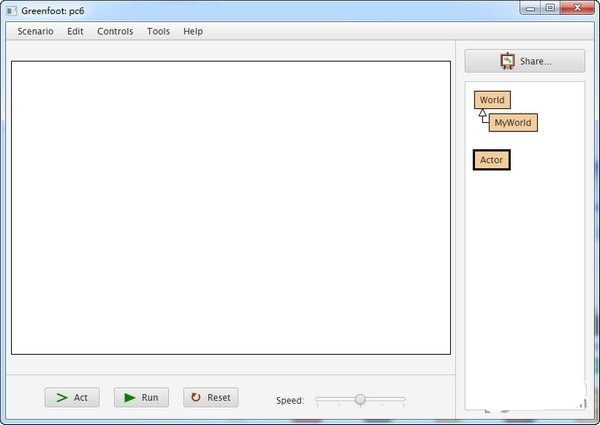 类(Class)是Java(也是所有面向对象高级语言)的核心内容.我们写程序的时候,99%的时间是在写一个个的类.可以看到在类列表中,已经有World和Actor两个类了,它们俩是Greenfoot最为核心的两个类,这在之后会慢慢介绍.除了这两个已有的类之外,我们之后所写的每一个类,都会出现在类列表中.类之间有相互继承的关系(之后介绍),这层关系在Greenfoot中将会被类列表清晰地体现出来.