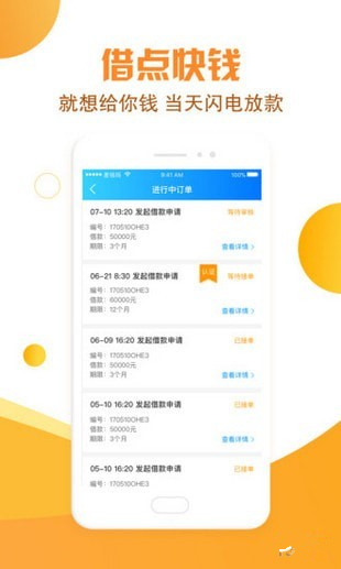 1、【便利的手机贷款】:用手机即可申请手机贷款,支持用户随时随地借钱.同时,通过支持在手机上实时查询借款进度,来提供便利的手机贷款服务.2、【分期无忧】:借款可以分期还,还有实时分期提醒等人性化的分期还款体验能够避免因逾期还款带来不良征信记录的风险.