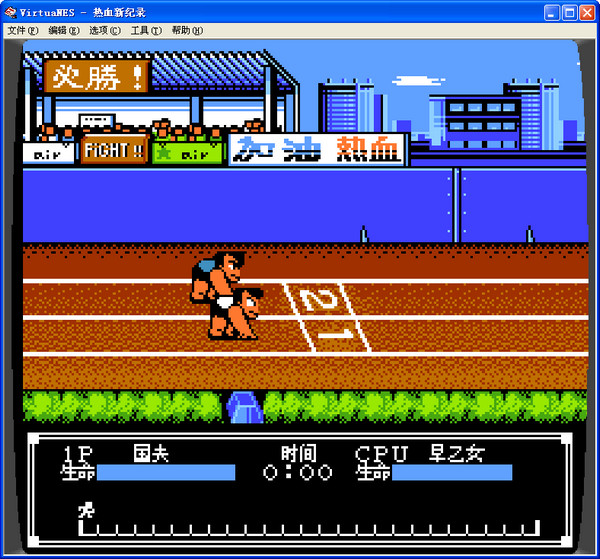 跳跃中按A 发出旋风腿,将对方打倒在跑道上,也能将跨栏踢碎,防御飞棍攻击。