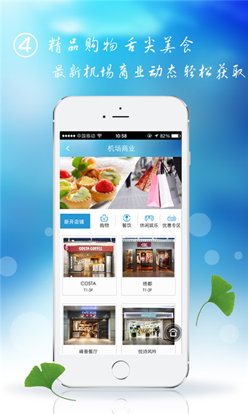餐饮购物:机场餐饮商业服务信息,帮助旅客寻找机场内商户或商品信息,包括商户外景照片、营业时间、服务电话、宣传广告以及品牌折扣等;