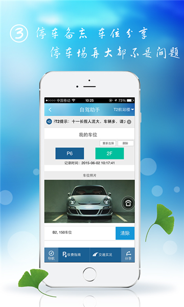 停车助手:旅客通过停车助手进行停车和找车,实现车位分享,同时向旅客提供停车场温馨提示以及停车收费指南等;