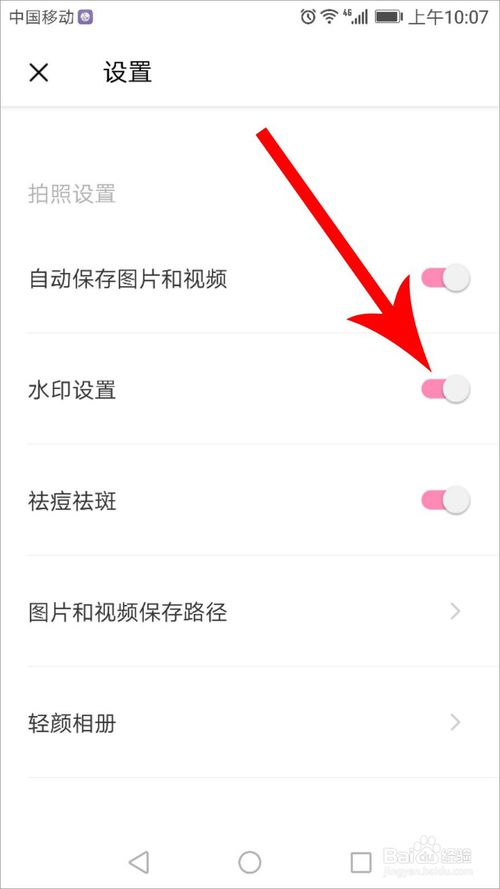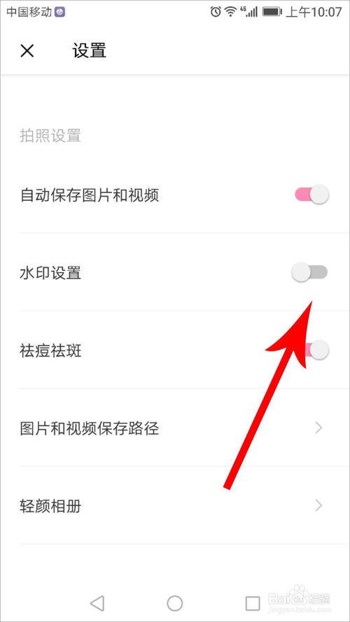 3、此时就可以打开轻颜相机设置列表了,从中可直接看到“水印设置”选项,找到后我们可以知道其后面的锁定按钮是粉色的,证明添加水印的功能是打开着的,点击此粉色按钮