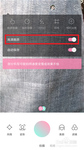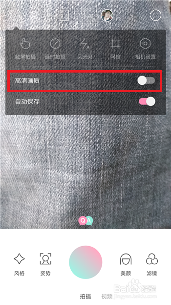 3、点击后会在顶部出现拍照设置的界面,找到【高清画质】选项,默认的是关闭的,点击打开后方的选项。