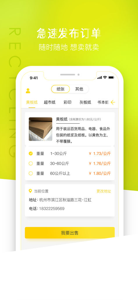 1.一键下单:无需走街串巷,只要动动手指即可在线下单;2.科学规划:智能分配距离您最近的废品回收员,确保第一时间上门回收;