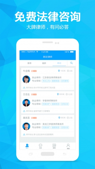 如果你是律师,分分钟刷新最新附近用户的法律咨询,获取案源,提升律师曝光率,完善律师个人品牌!通过品牌和与口碑传播,崇法能让你更加专注于自己的领域,让你不必担心服务后收不到律师费。
