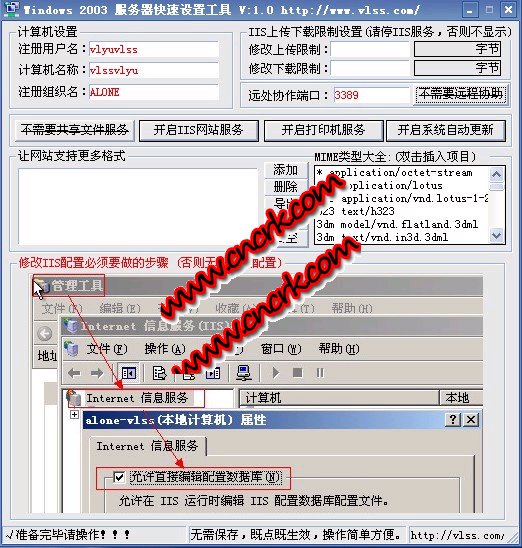 windows 2003 服务器快速设置工具是一款可快捷设置win2003的工具,win2003设置iis上传限制和下载限制很是繁人,经常因为修改多次导致丢失,并且设置mime文件支持格式也是非常的麻烦,此工具可解决以上的问题,非常简单的操作,即点即生效。 附加可快速的设置计算机器用户、名称和组织名称,而不需要再那么麻烦的打开注册表在一个一个的修改,附加可快捷设置远程桌面端口、个别首要的共享服务、iis服务、打印机服务、自动更新服务和远程桌面。