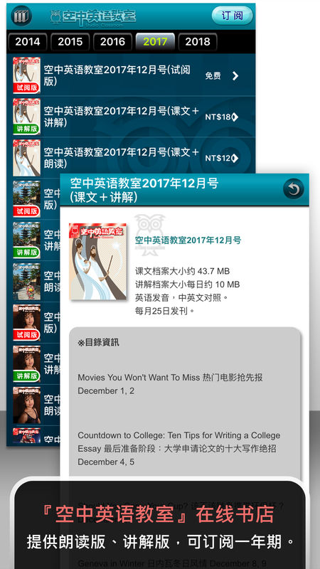 空中英语教室app具有扎实丰富的内容、配合广播与电视的教学,多年来,赢得金鼎奖等奖项与肯定。目前空中英语教室软件亦于中国大陆、美、加、欧洲、澳、纽等地发行并播送。