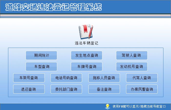 《道路交通违法登记管理系统》可以提高工作的效率,支持信息的共享, 既能够减轻管理部门监督员工作强度的非常重要的。 系统包含: 1、违法车辆管理:违法车辆登记 2、统计汇总:期间统计、发生地点查询、驾驶人查询、车型查询、车牌号查询、发动机号查询、车架号查询、电话号码查询、拖移人员查询、代驾人查询、退还查询、委托部门查询、办案民警查询、备注查询。